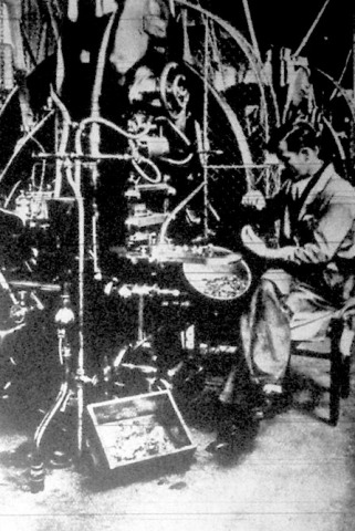 Bizony a Pénz Őfelségének bölcsőháza semmiben sem különbözik egy váciúti gyár udvarától. A nagy műhelyablakok mögött gépek morognak, dörmögnek s az első terem egyszerű, de tágas kovácsműhelyhez hasonlít. Aszbesztkesztyűs munkások éppen a terem közepén elfutó kis vaskohókba töltögetik az izzó ezüstöt.